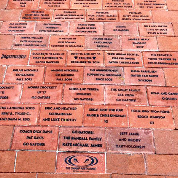Leave your mark that will last a lifetime at The Swamp! Purchase a custom, engraved brick to commemorate your family, friends, or students and create YOUR addition to The Swamp legacy. The courtyard at the new Swamp location is surfaced in custom engraved bricks that will remain at the location permanently. It's a lasting reminder of your time in Gainesville and at the University of Florida.